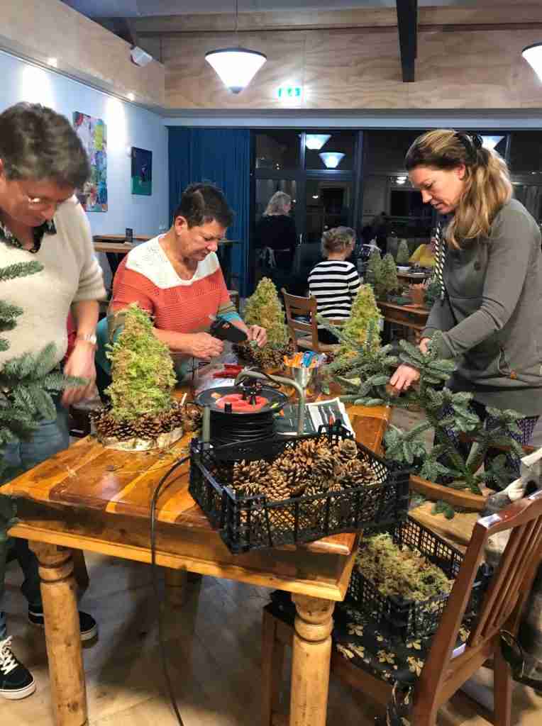 Onder leiding van Josja van Mierlo (van het Bloemenlokaal) zijn met een wijnfles, kranten, mos, veel ijzerdraad en meters plakband stellages gebouwd. Deze zijn met onder andere dennenappels, dubbelgeklapte appelschijfjes, besjes, dennentakjes en mini kerstlichtjes tot mooi kerststuk omgetoverd.