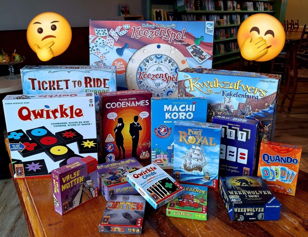 Er zijn veel spellen beschikbaar die we graag uitleggen en spelen. Er zijn bord- en kaartspellen die lekker snel gespeeld kunnen worden, maar ook bordspellen waar je wel een uurtje (of twee) mee zoet bent. Maar misschien heb jij ook een spel dat je graag speelt en aan anderen wilt leren. Breng het mee!