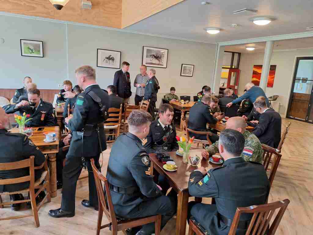 Het regiment was te gast bij de gemeente en kwam rond 11.00u aan in De Kei voor een kop koffie met cake. De cakes waren gebakken door enkele vrijwilligers van cakemixen van de Bronkhorster Molen. Rinse Kooistra heette de militairen van harte welkom en sprak de wens uit dat ze een prachtige dag in de regio zouden mogen beleven. Het was een even intense als hartelijke bijeenkomst, waar ook burgemeester Patrick van Domburg ‘acte de présence’ gaf.