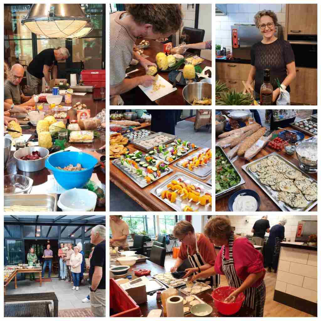 In De Kei hebben we op 12 juli de vakantie ingeluid met een zomerse buitenmaaltijd zonder vlees. Samengesteld en gemaakt door acht ‘koks’, werden er om 19 uur gerechten op schalen naar buiten gebracht. Daar stonden op het terras de barbecue en het rookoventje klaar, waarin de houtskool al brandde en de houtmot rookte. En daar waren ook de ‘gasten’ aanwezig, die zonder iets te hoeven doen, konden aanschuiven aan de dis. Hooguit legden zij hun eigen gerechtjes op de barbecue.