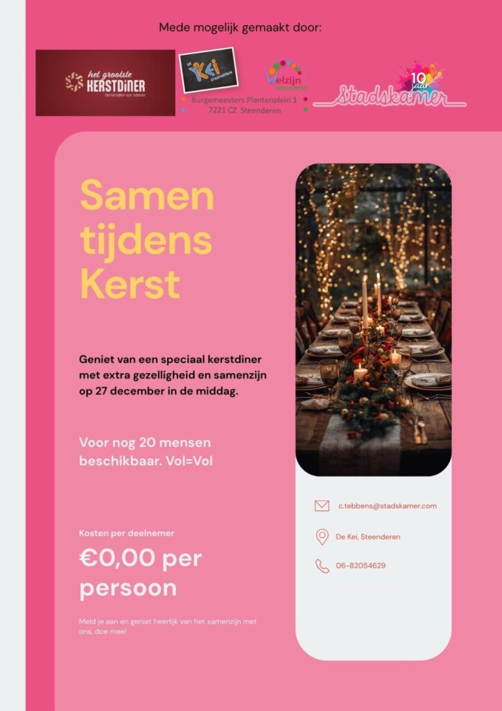 Op 27 december kun je ‘s middags aanschuiven bij het Grote Kerstdiner, dat wordt georganiseerd door de Dorpskamer en Welzijn Steenderen.