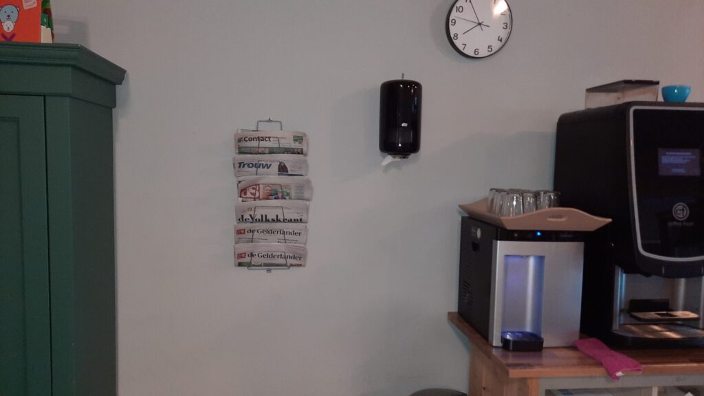 Aan de muur naast de koffiemachine is nu een krantenrekje te vinden.