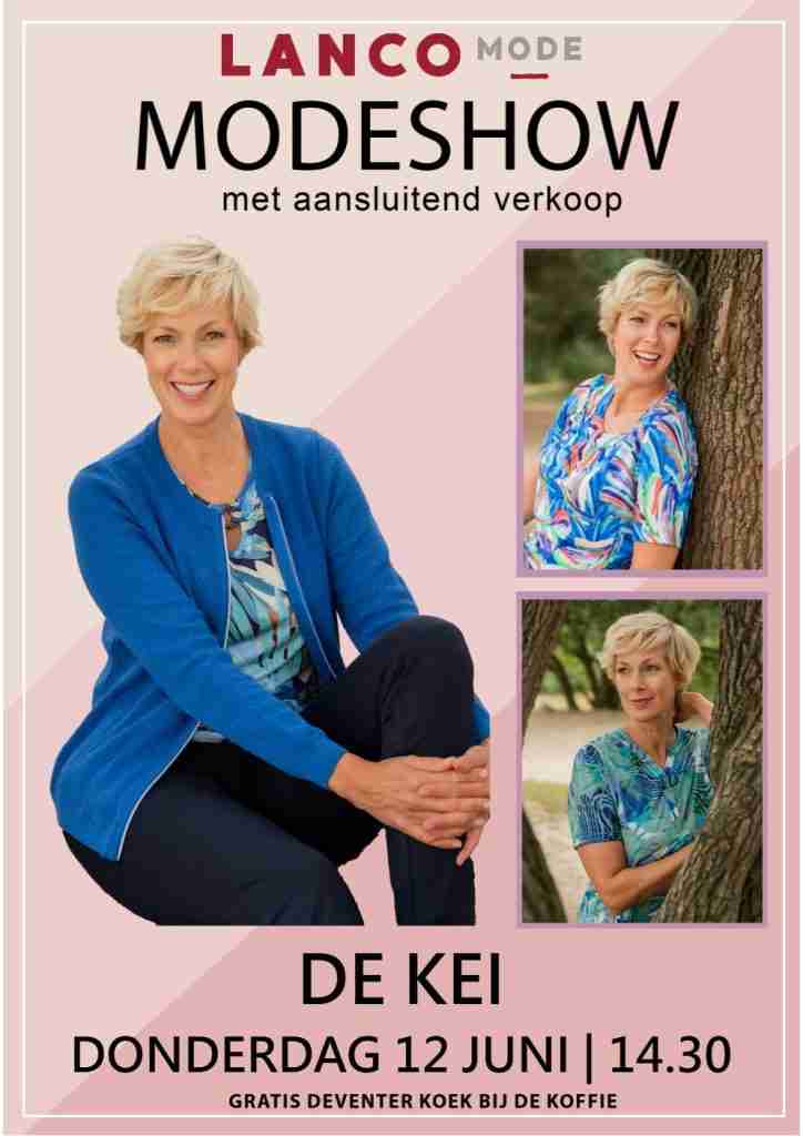 Op donderdag 12 juni a.s. vanaf 14.30 uur is er een modeschow van Lanco-mode in De Kei met aansluitend verkoop. Iedereen is welkom om te komen kijken. Een kopje koffie of thee ontbreekt natuurlijk niet. Aanmelden is niet nodig.