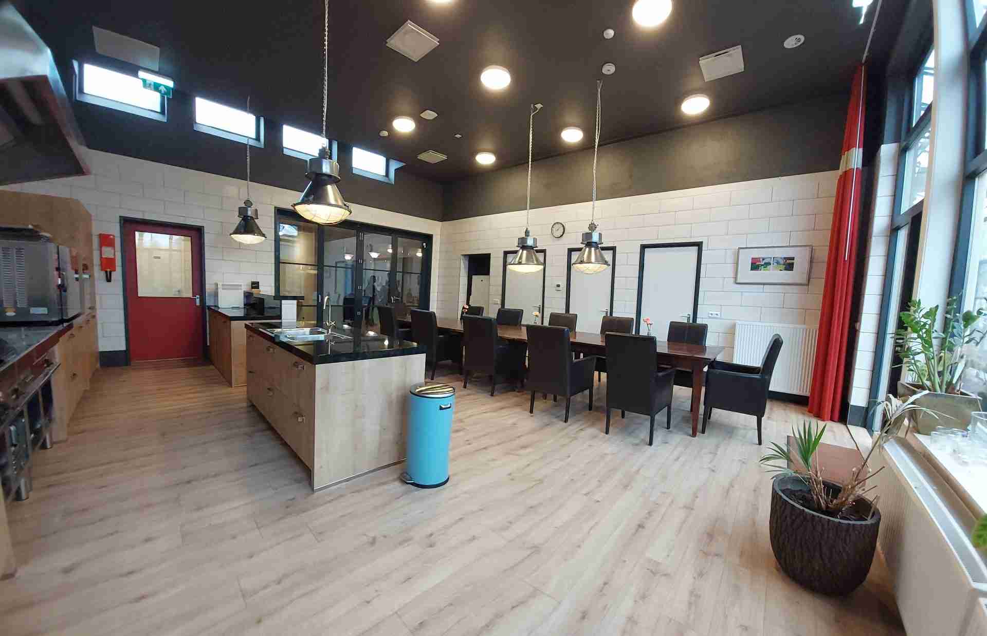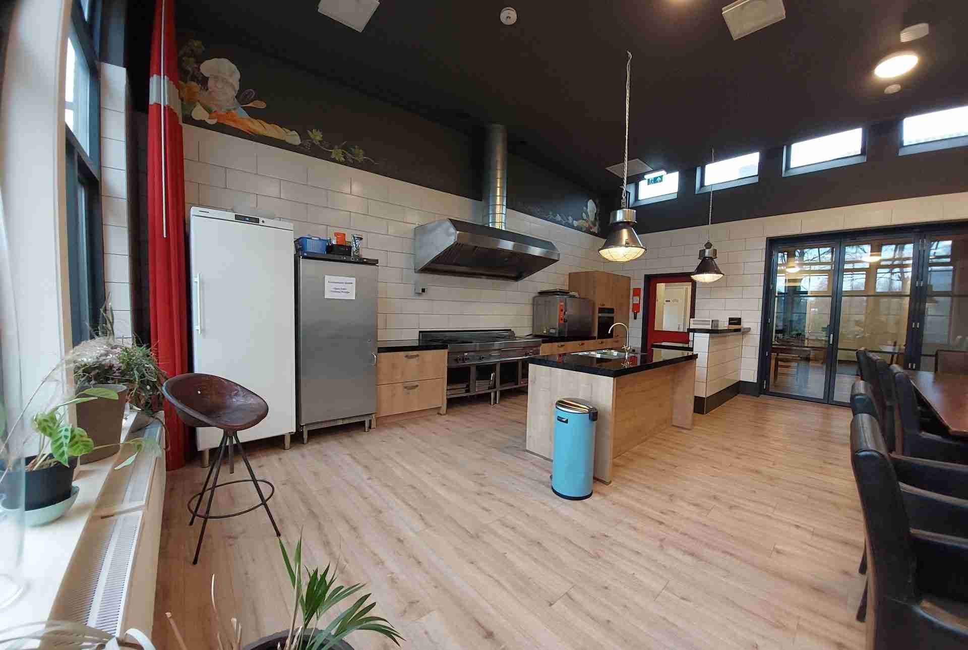 De keuken is een prachtige ruimte geschikt om te vergaderen of te koken of een combinatie van beide (teambuilding). De apparatuur nodigt uit om van alles uit te proberen of juist aangeleerd te krijgen. De ruimte grenst aan de kas, dus met een beetje geluk valt er daar nog iets te oogsten.