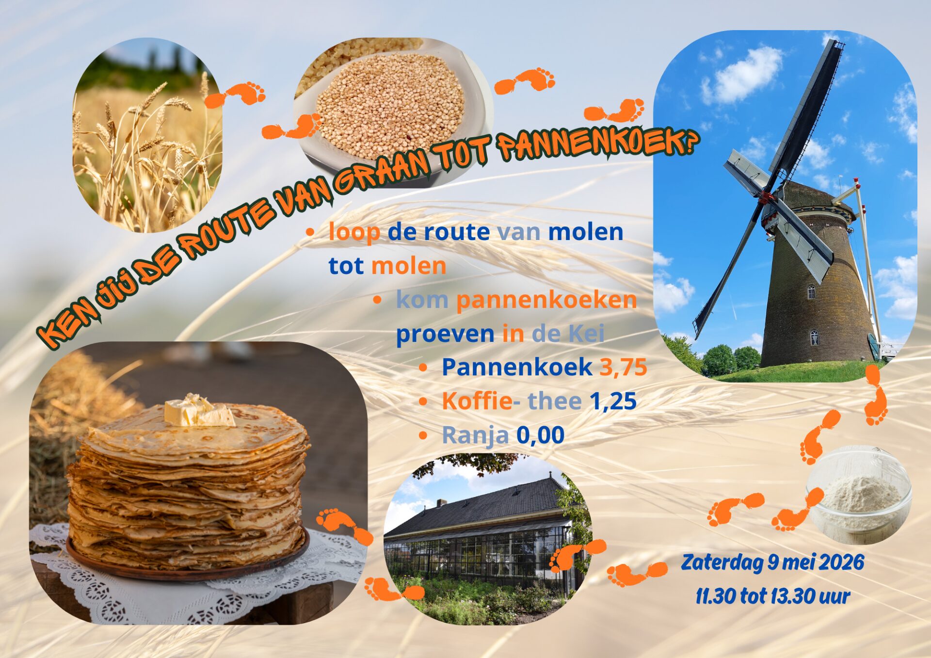 Op 9 mei is het Nationale Molendag. Kom dan van 11.30 tot 13.30 uur pannenkoeken eten in De Kei. Gebakken met molen van de Bronkhorster Molen. Gemaakt door vrijwilligers van De Kei.