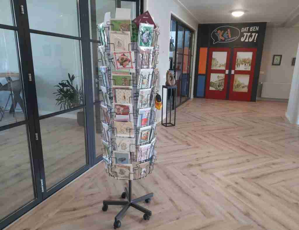 De kaartenstandaard op De Kei is weer goed gevuld met zelfgemaakte kaarten van Stichting Welzijn. Op de creatieve woensdagochtend wordt er hard gewerkt om dit zo te houden, maar soms zijn ze niet aan te slepen. Je mag ze zelf komen uitzoeken, geld kan gewoon in het klompje gedaan worden.